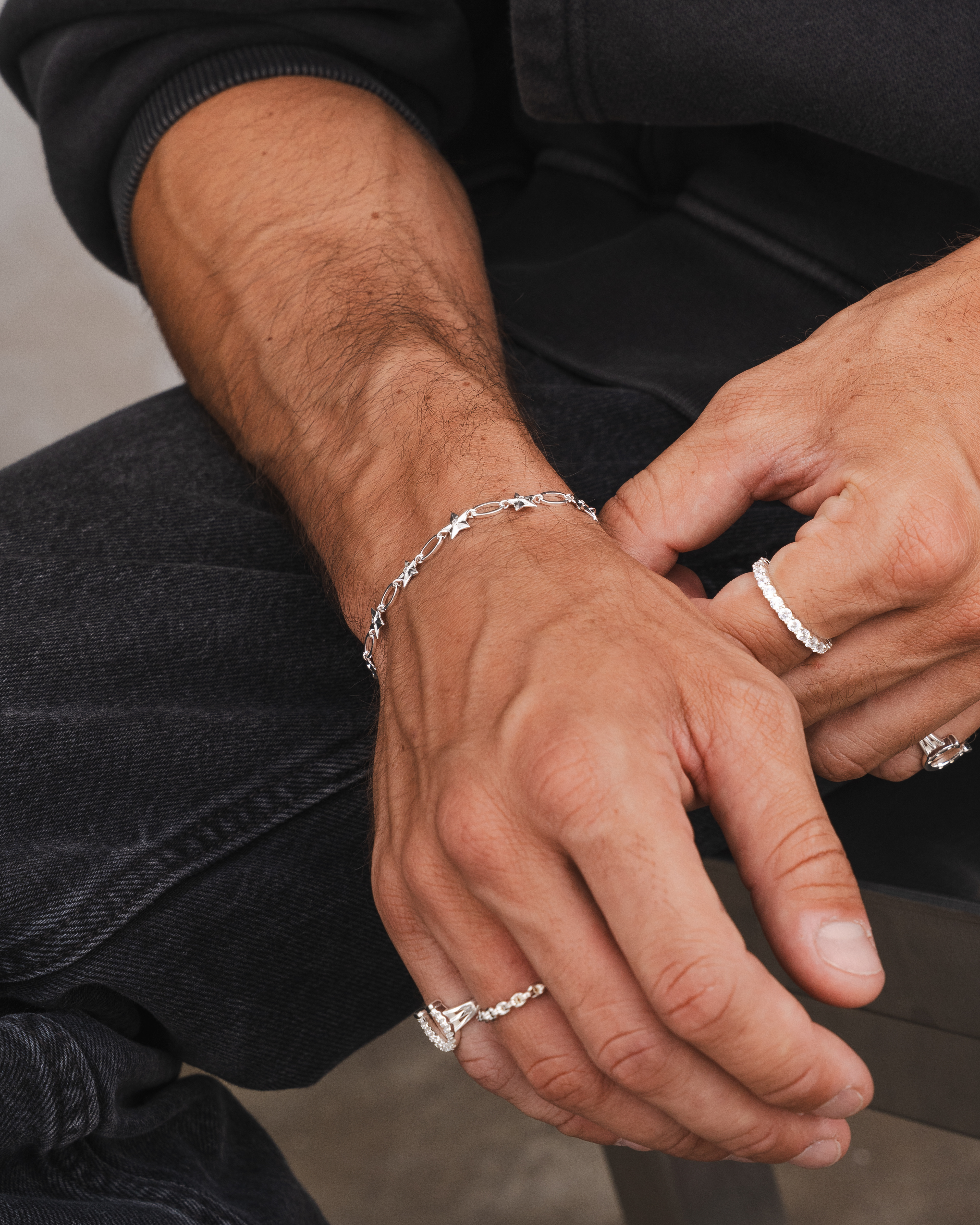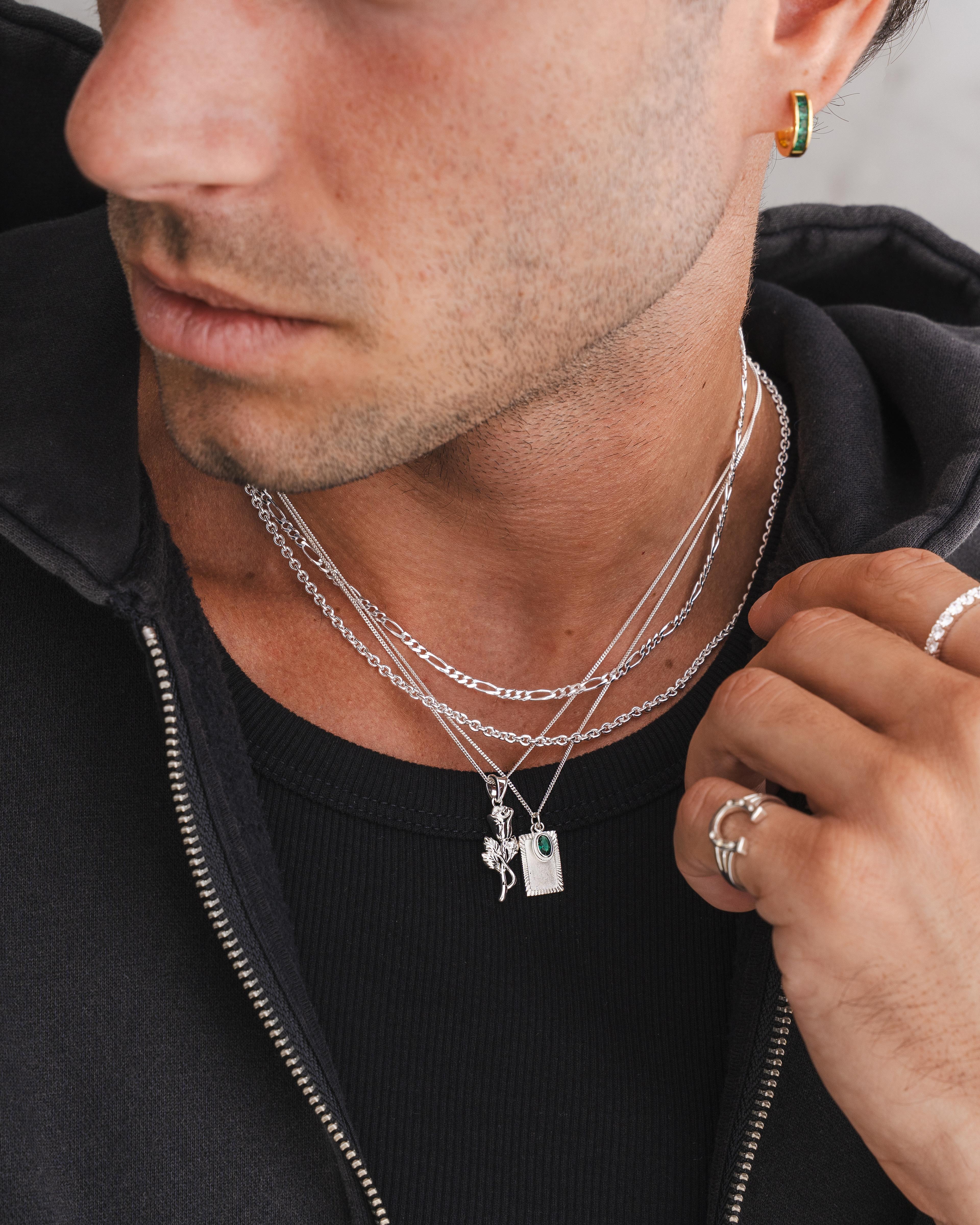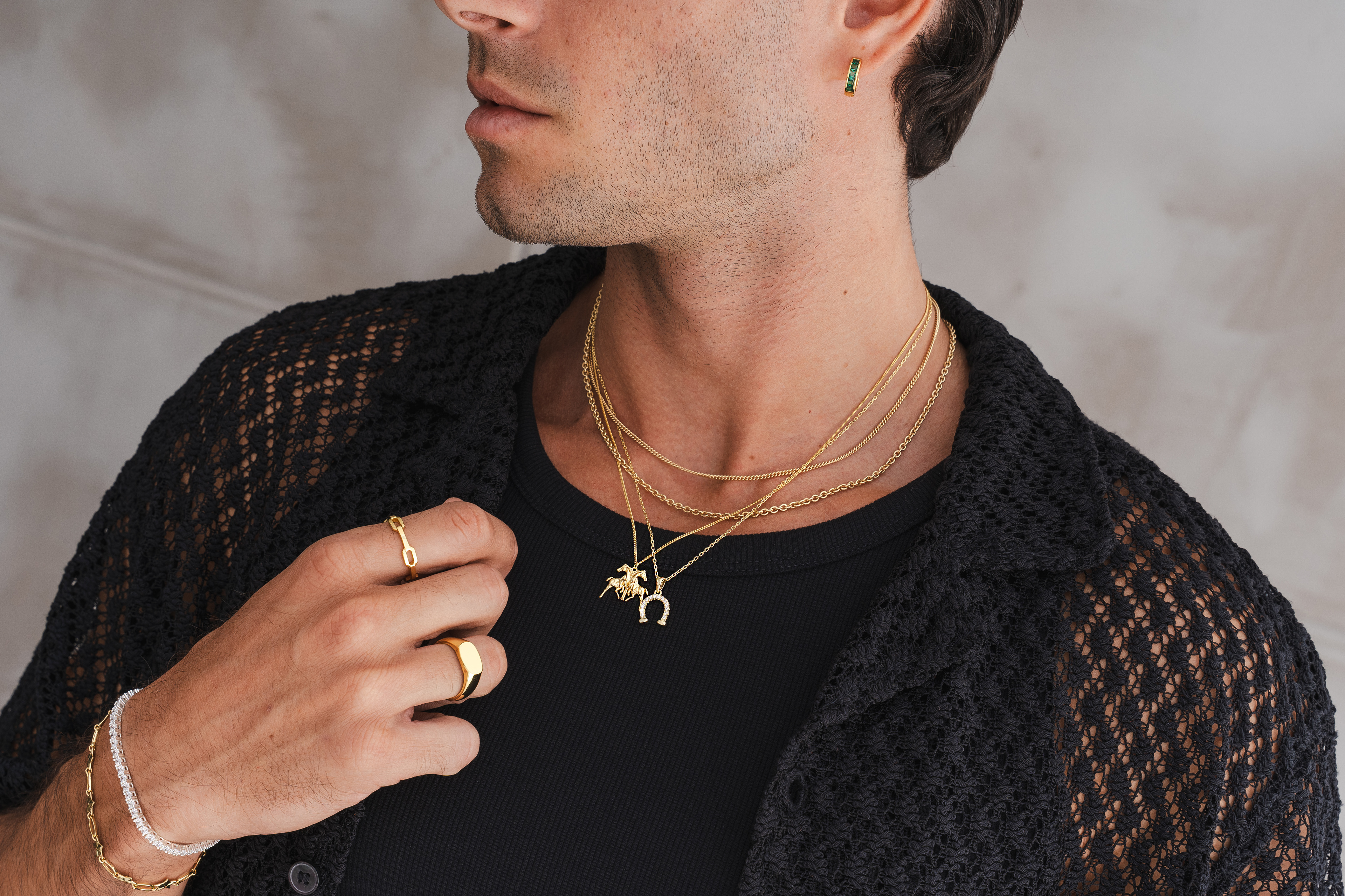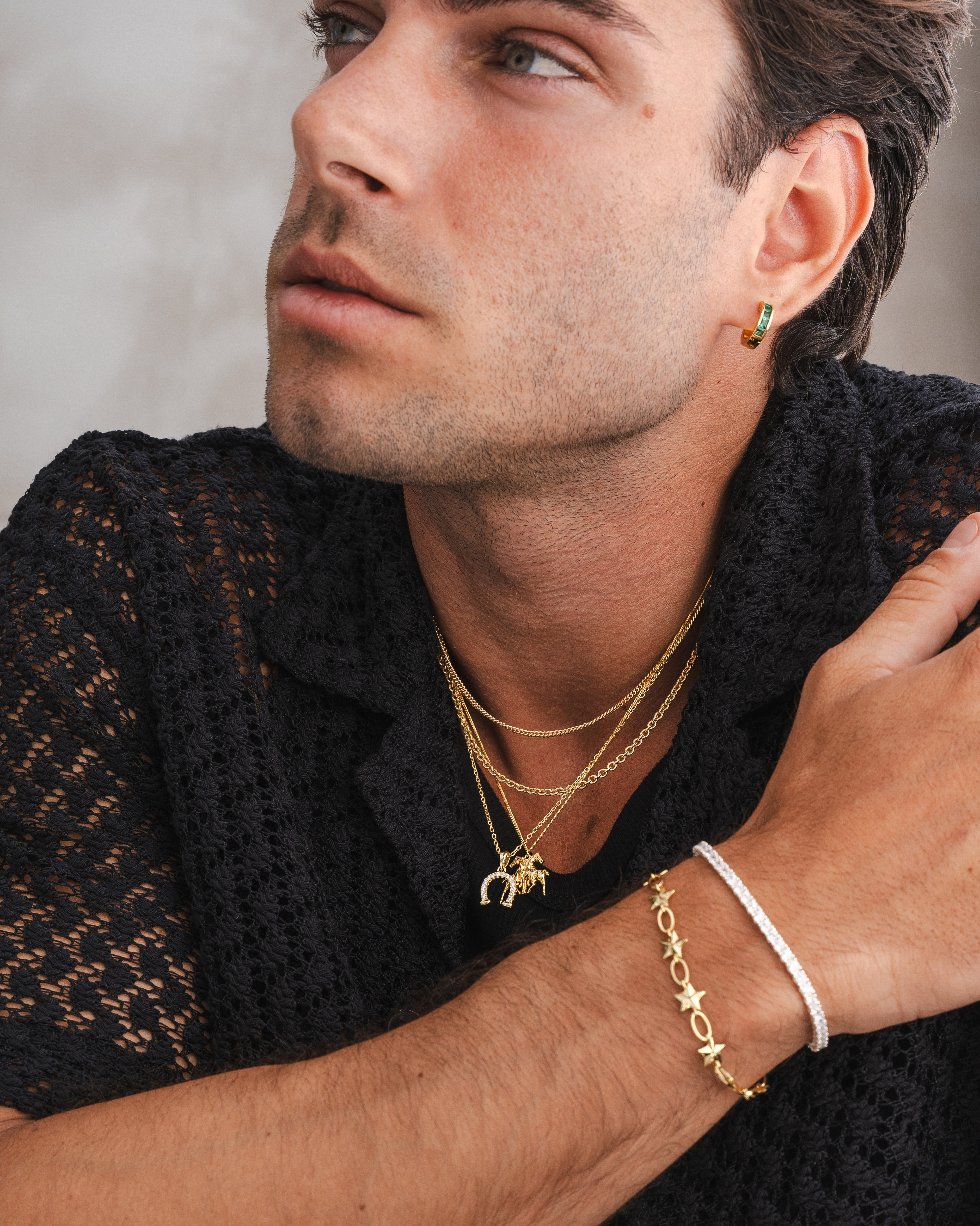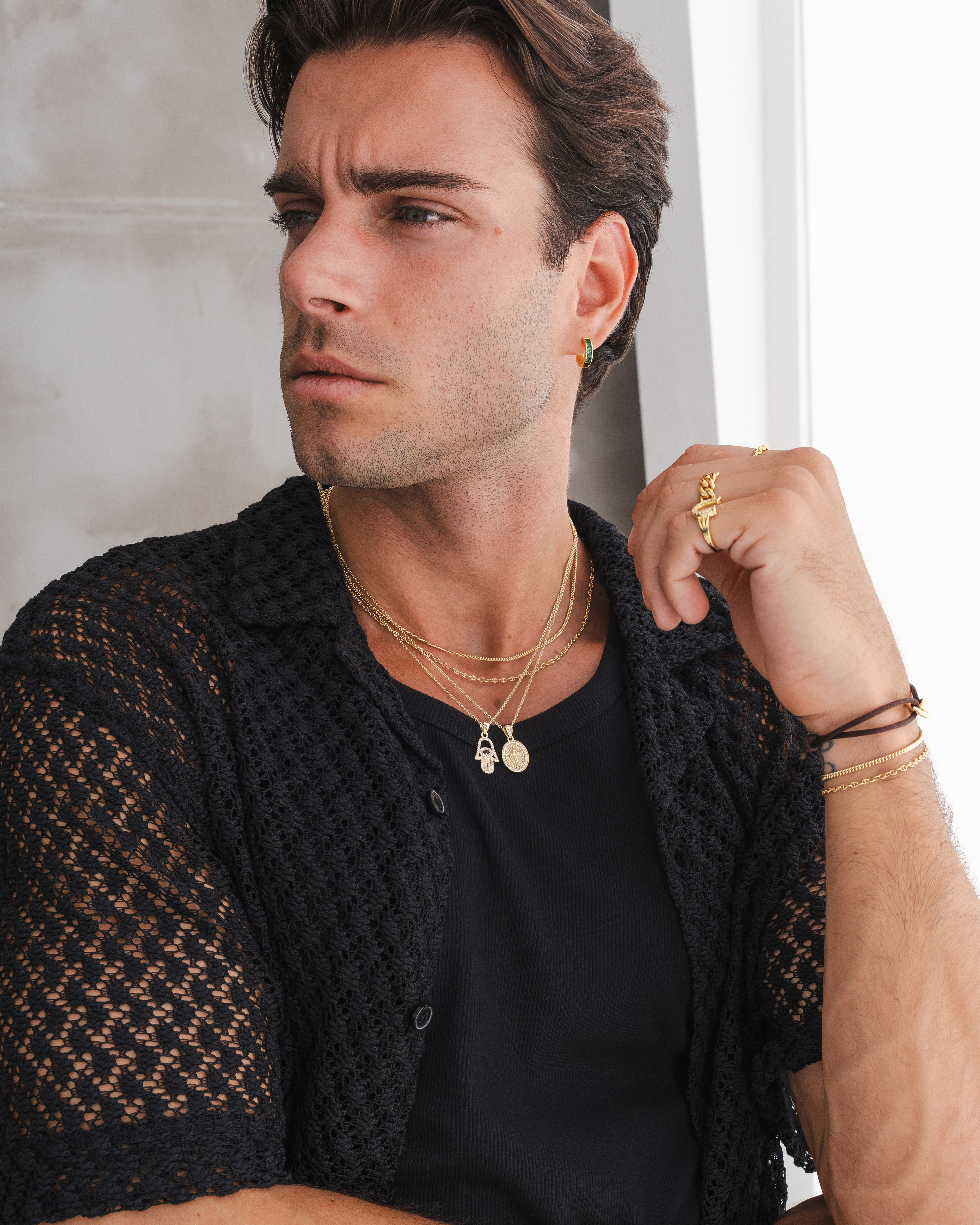 Lifestyle imagery for commonlines. We shot a mixture of ecom images against a white background as well as lifestyle imagery, where we layered up the products to make the jewellery stand out on the model.